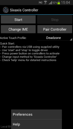Lancez maintenant Sixaxis Controller et allez dans les préférences (accessible via le bouton "Options" de votre smartphone):