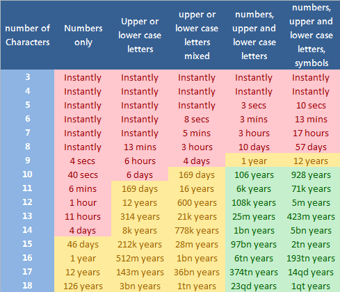 Comme une image résume mille mots, voici un tableau repris du site ghack.net qui montre le temps nécessaire à cracker un mot de passe (par bruteforce, qui consiste à tester toutes les clés possibles) selon sa complexité: